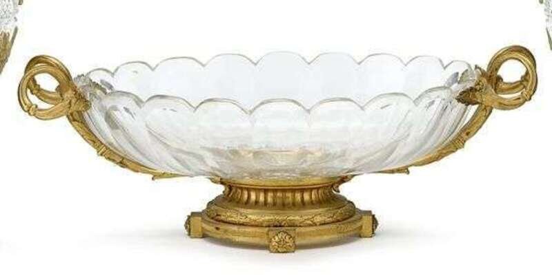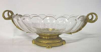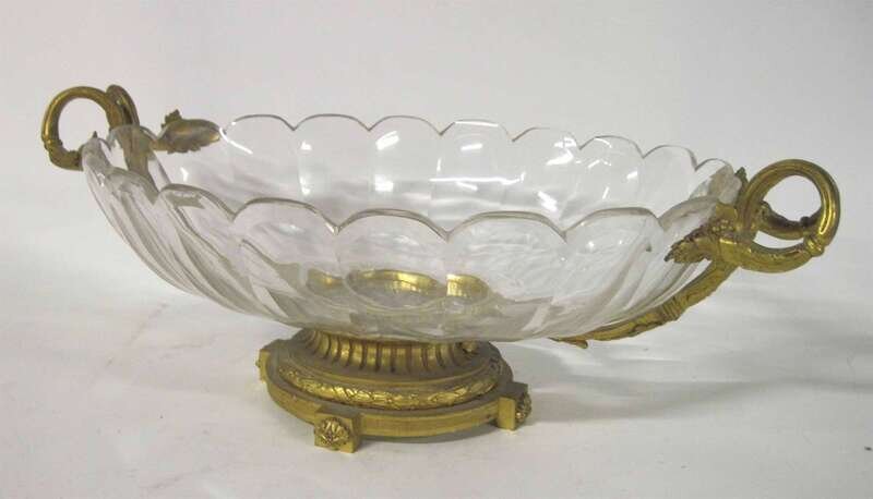 The lobed oval bowl in a gilt bronze frame with foliate cast scrolling handles, on a fluted and laurel wreath banded oval foot mounted with rosettes.