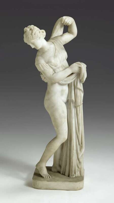White marble figure depicting the draped nude figure looking over her right shoulder.