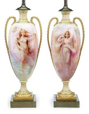 The ovoid bodies with gilt loop handles, painted with semi-nude nymphs attended by putti, signed 'E. White', on a square foot; mounted as lamps. (2).