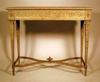The cream painted molded rectangular top above a scrolling foliate carved frieze, raised on carved and tapered square legs joined with a shaped X-form stretcher.