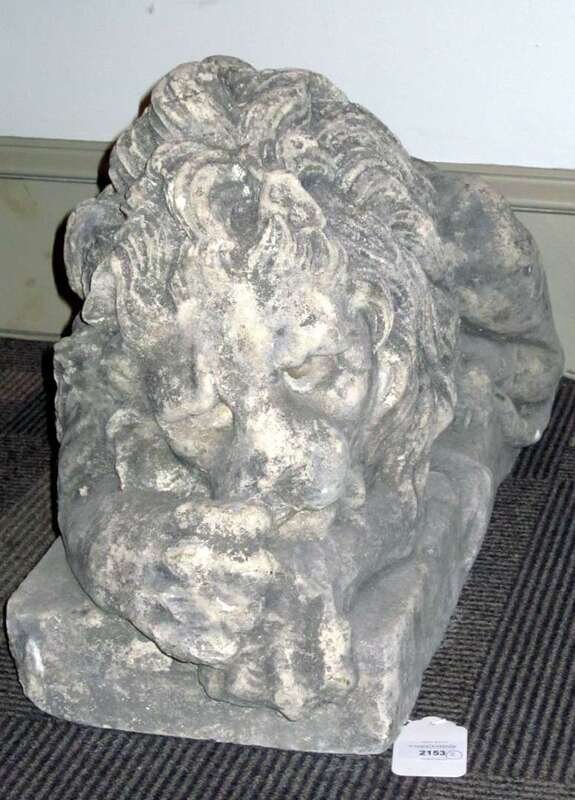 Each modeled as a recumbent lion and raised on a rectangular plinth base. (2).