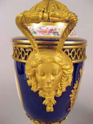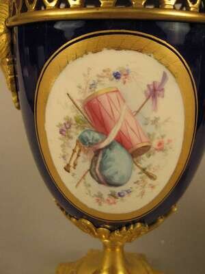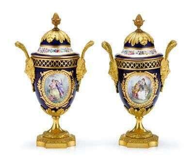 Each of urn form with domed lids surmounted by a gilt bronze cap and an acorn finial, above a reticulated collar and mask mounted loop handles, painted with reserves depicting courting couples in 18th century dress; the reverse with musical trophies, on a cobalt ground, raised on a foliate cast gilt bronze circular foot and square base. (2).