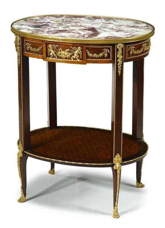 The brass banded oval Breche de Medicis marble tops above a frieze with applied gilt bronze mounts of putti and foliate scrolls, raised on square legs joined by a conforming parquetry undertier, ending on gilt bronze lined short cabriole legs with gilt paw feet.
