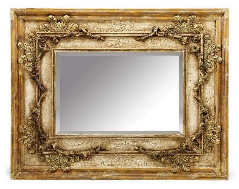 The rectangular beveled mirror plate in a molded straight wide frame with deeply carved twining foliate garlands.