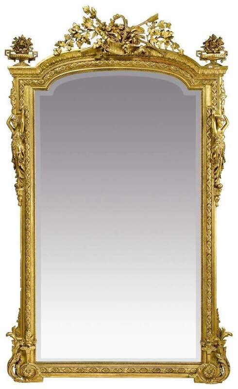 The rectangular mirror plate with a bevel edge and arched top set in an ornately carved giltwood frame flanked by female terms and surmounted by a central flowering basket and urn finials.