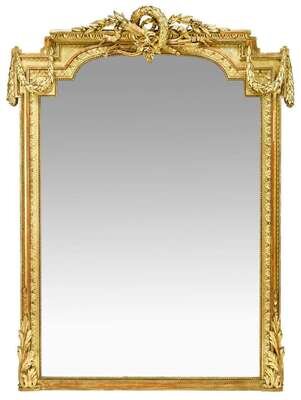 The tall arched rectangular mirror plate with an egg and dart carved gilt cornice centered by a laurel wreath and trophy cresting and hung with laurel swags, and enclosed in a molded giltwood frame, the lower corners marked with acanthus.