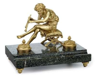 The gilt bronze figure of a Bacchic youth seated on an X-form stool, on a rectangular mottled green rectangular marble stand with pen trough and two foliate cast inkpots with berry finials, raised on acanthus cast feet.