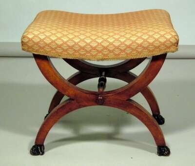 The rectangular curved padded seat raised on x-form supports united by a turned stretcher and ending on painted paw feet.