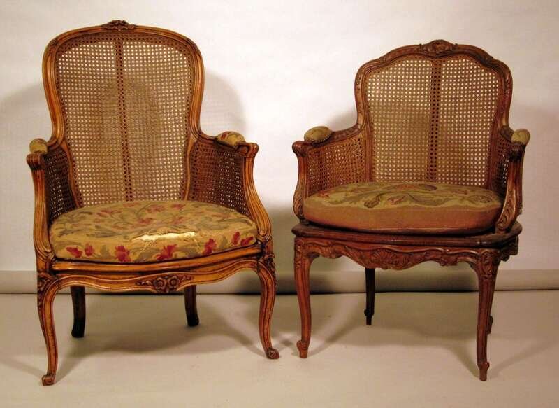 Each with a curved caned back with a carved crest rail and continuing to part padded enclosed arms, above shaped caned seats with needlework loose cushions, raised on foliate carved cabriole legs. (2).