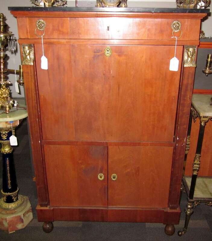The rectangular gray marble top over a frieze drawer, and drop down writing surface flanked by square columns headed by female terms, above a pair of cupboard doors, raised on ball feet.