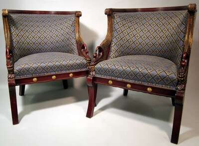 Pair of Empire style mahogany parcel gilt gondola armchairs