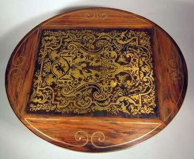 The circular rosewood top with a brass bound edge and brass scroll inlay, centered with a square boulle marquetry insert panel, raised on a carved column and four s-scoll legs ending on brass caps.