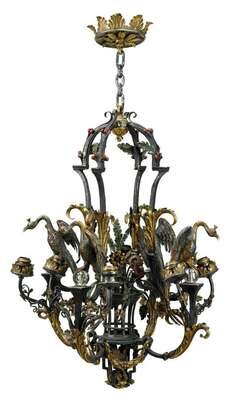 Unusual Continental cold painted bronze and glass mounted birdcage chandelier 19th century