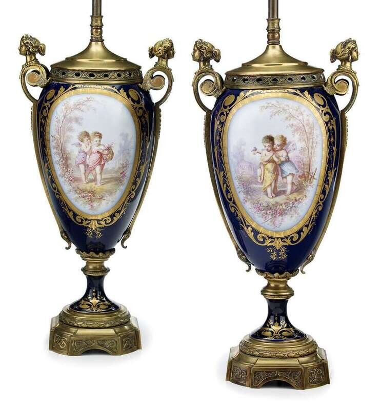 The tapered ovoid bodies painted with oval reserves painted with amorous putti, against a cobalt blue ground with gilt details, mounted with short scroll handles with Classical head finials; mounted as lamps.(2).