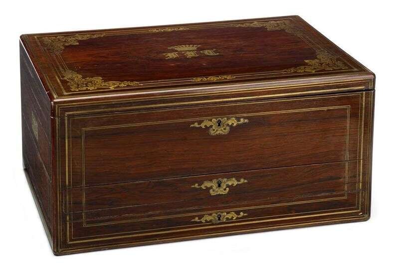 French brass inlaid rosewood artist's work box retailed by jeanne a paris, late 19th century