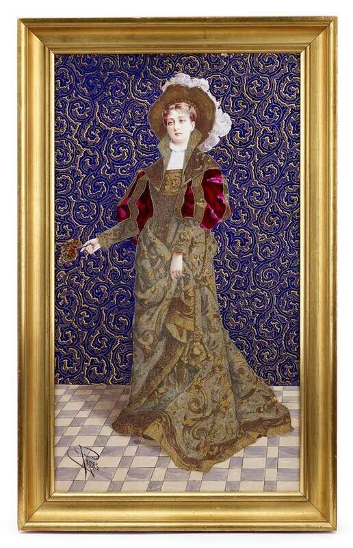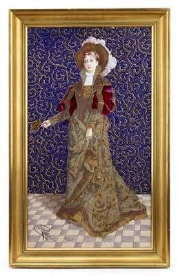 The rectangular plaque depicting a young woman in a 'jeweled' Renaissance dress and holding a fan, signed E. Pages, against a cobalt and gilt scroll ground, the enameling attributed to Emile Delforge, after the painting by Alfred Francois Gues, in a giltwood frame.