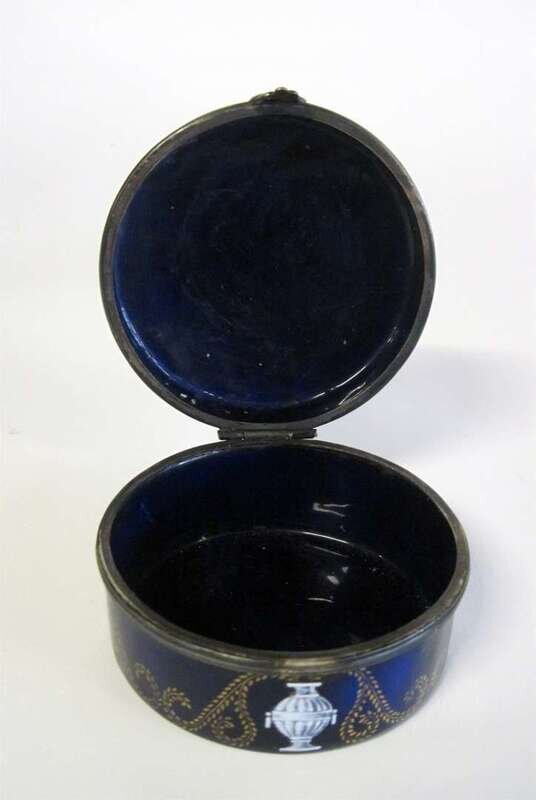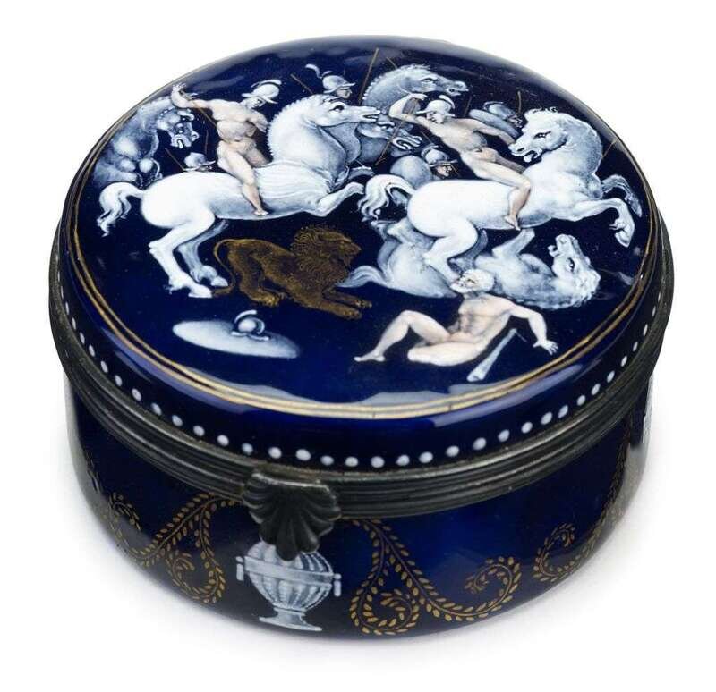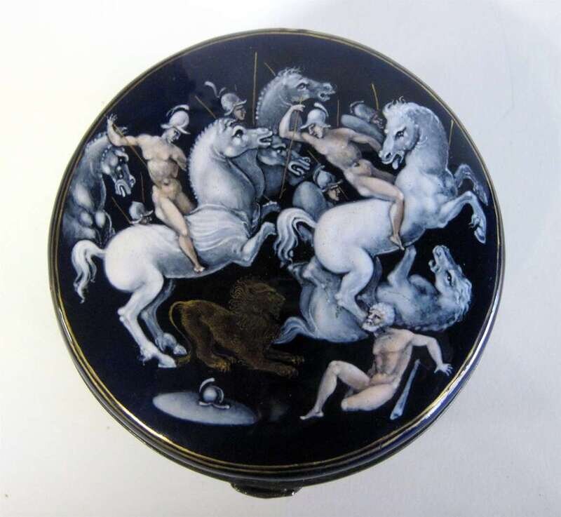 Circular, the hinged cover enameled with a mythological hunt scene with soldiers on horseback attacking a lion, on a cobalt ground.