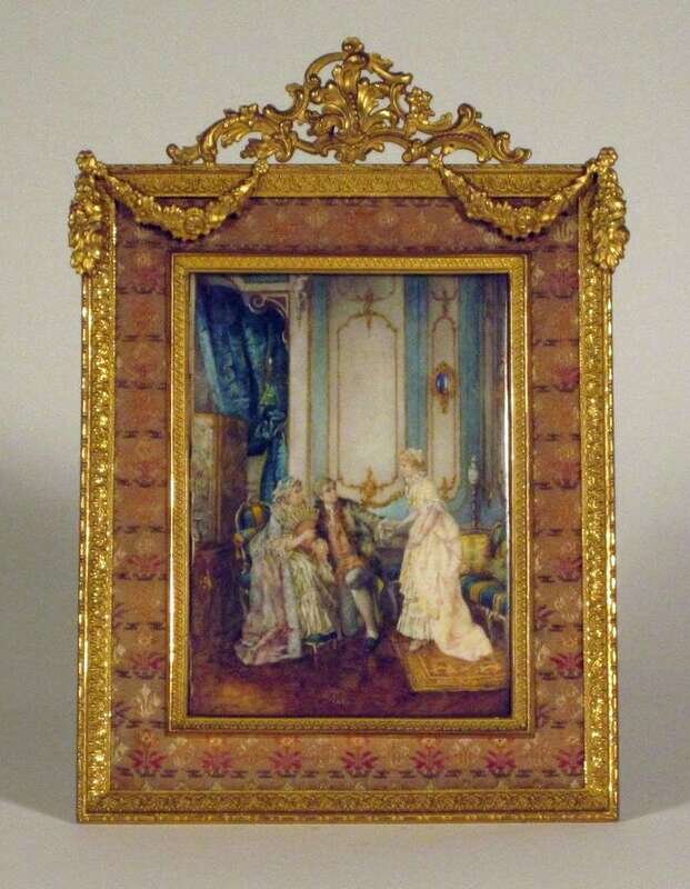 Depicting 18th century figures in an interior, in a gilt metal frame with pierced cresting hung with garlands.