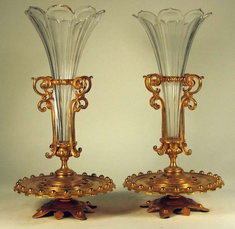Pair of glass trumpet vases with gilt metal stands 20th century