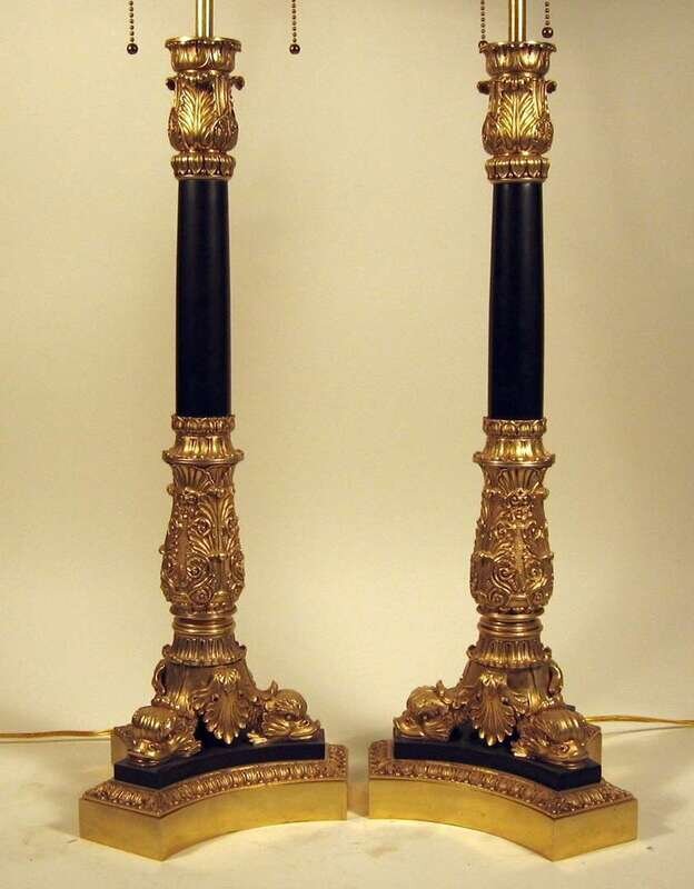 Each with an acanthus cast nozzle above a cylindrical black marble standard, raised on acanthus cast base with dolphin form feet and triform base; electrified. (2).