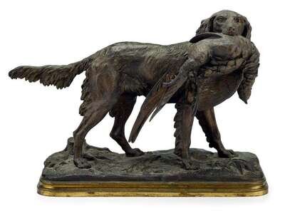 Bronze, medium brown patina, with a pheasant in his mouth, on a rectangular base, signed 'A. Dubucand'.