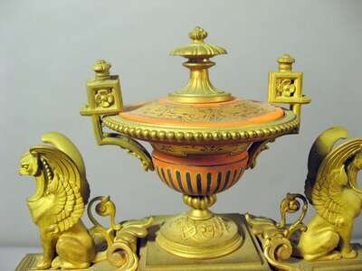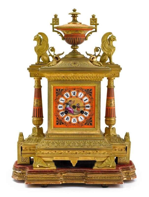 Fine French Egyptian Revival gilt bronze and champleve enamel mantel clock paris, 19th century, retailed in belfast