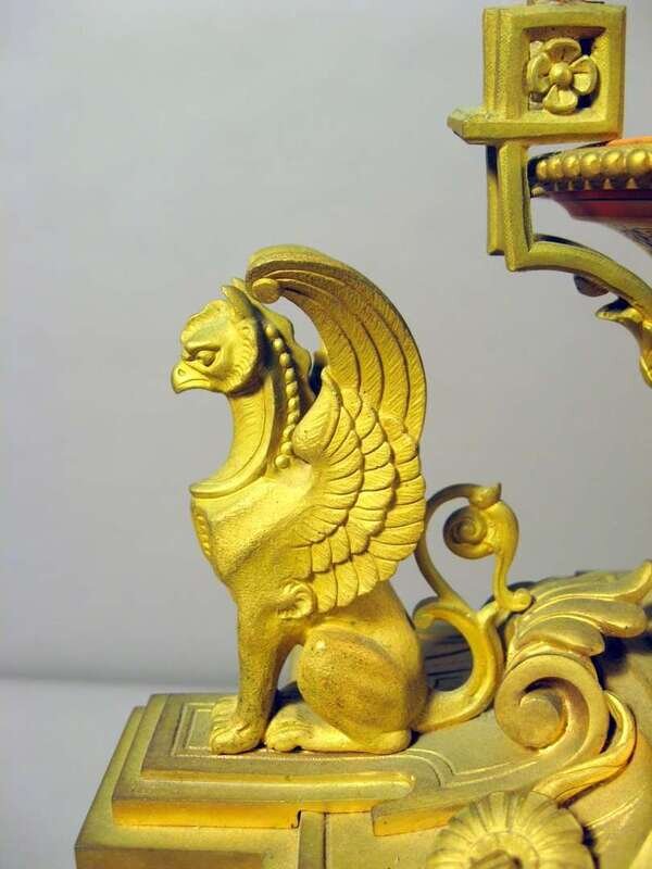 The square enameled Roman numeral dial centered by a painted classical reserve, set into an upright case flanked by freestanding columns surmounted by an urn and seated griffins, on a stepped acanthus cast scroll base and giltwood stand.