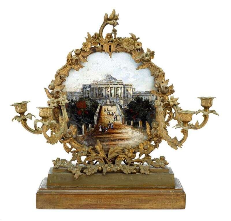 The shaped circular floral cast gilt-metal frame enclosing a mother-of-pearl and glass panel painted with a view of a palace, the frame issuing four foliate cast candle arms, raised on a stepped metal base mounted to a rectangular wood plinth.