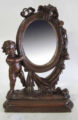 With an oval mirror plate supported by a cherub raised on shaped rectangular base.