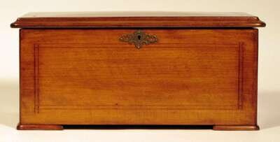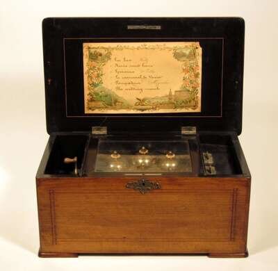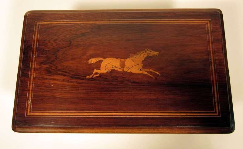 The rectangular hinged top inlaid with a horse, opening to a cylinder playing six airs and three bells.
