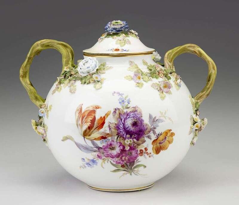 Globular with vine loop handles and a flower mounted cover, the sides painted with floral bouquets and applied with flowers and foliage, underglaze blue crossed swords and incised marks.