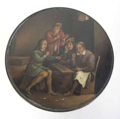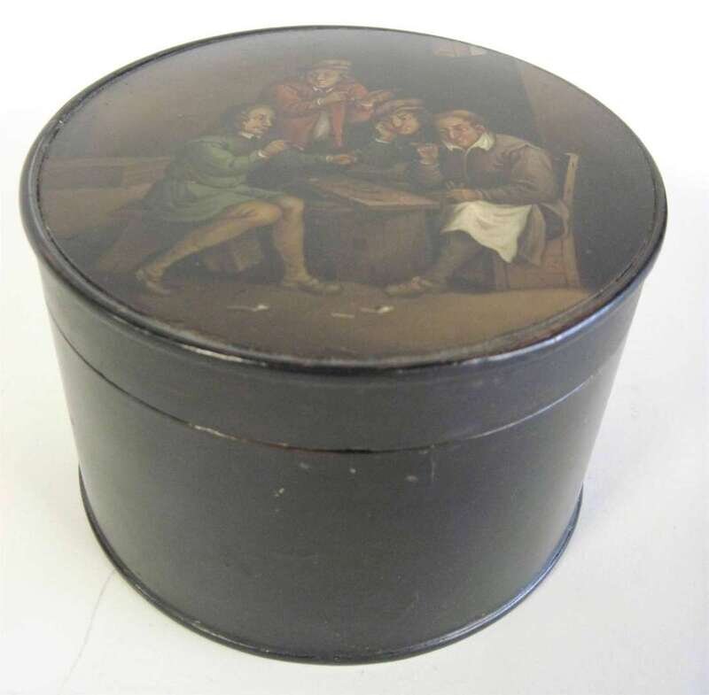 The cylindrical box with a cover depicting gentlemen smoking around a table, signs of lead lined interior.