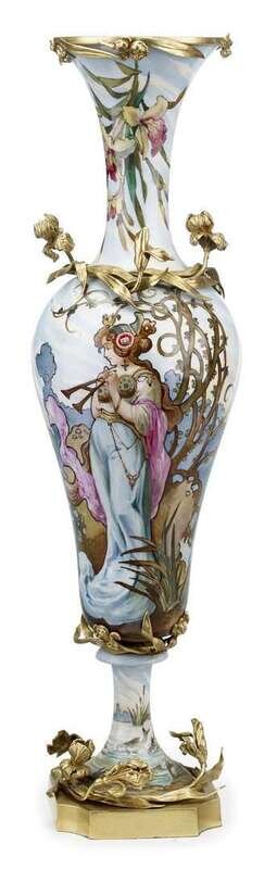 Of baluster form painted with a young woman holding pipes beside a lake, signed L. Tisserand, with gilt metal mounts in the form of iris garlands to the base and shoulder.