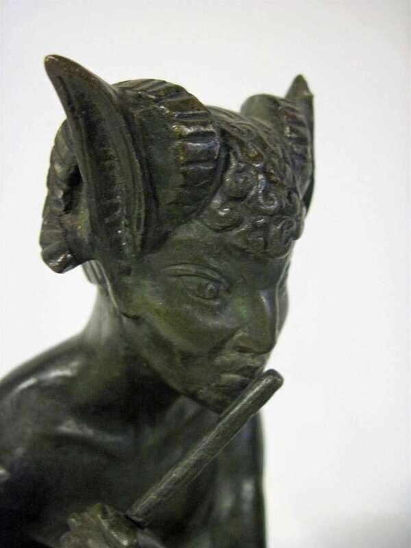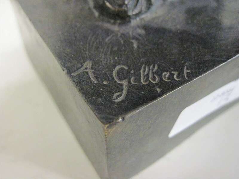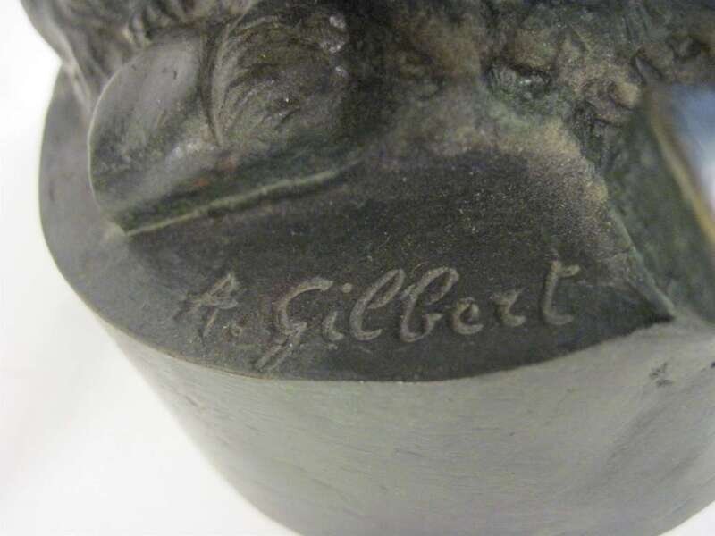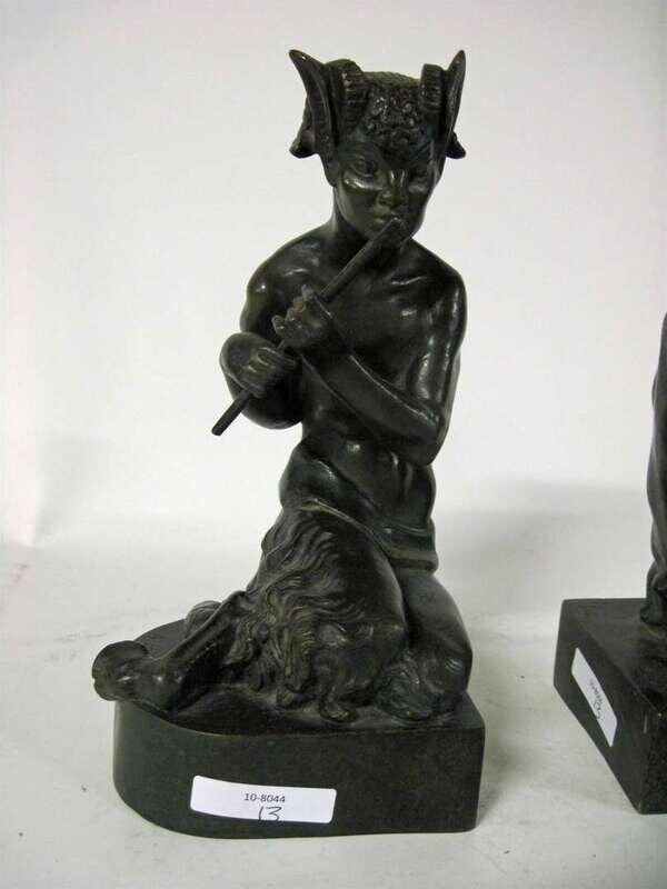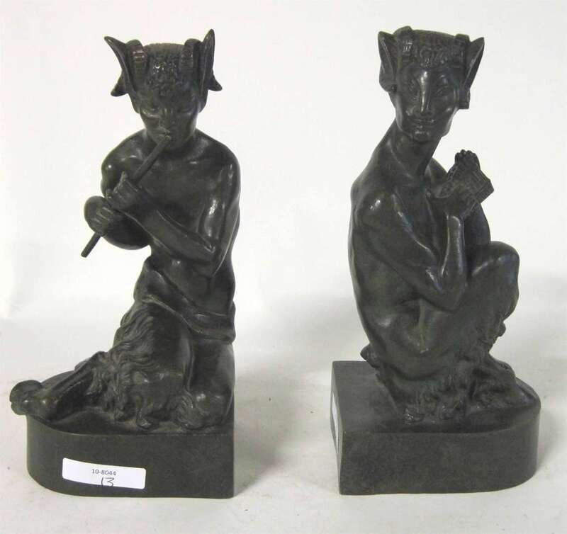 Bronze, dark green patina, each modeled as a crouching Faun, inscribed 'A. Gilbert', raised on a shaped marble base. (2).