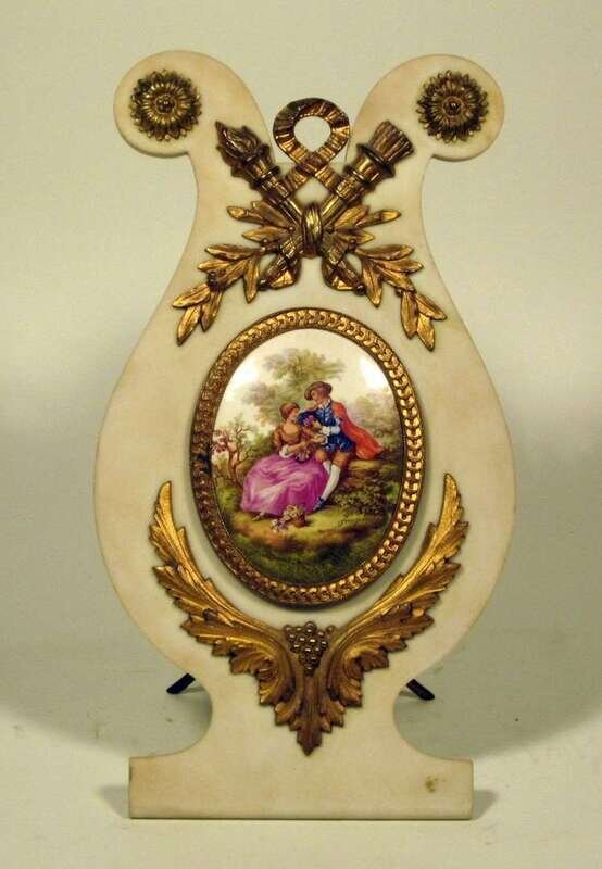 The lyre form marble frame mounted with a ribbon tied trophy over an oval porcelan plaque depicting a courting couple, with an easel support.