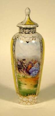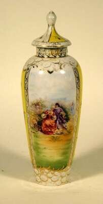 Tapered baluster form, the cover with a spire finial, painted with alternating reserves of amorous couples and foliate sprigs on a yellow ground, underglaze blue hatch marks.