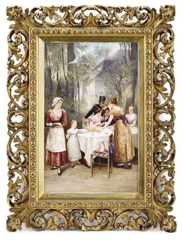 Painted with a scene of a garden party, signed 'Jos. Zasche, Wien', in a foliate carved, pierced and gilt frame.