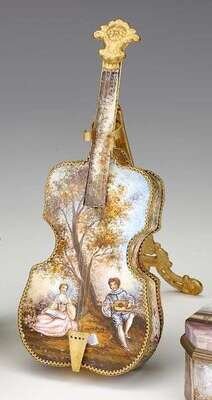 Enameled on all sided with scenes of musical couples and cupids, with a gilt metal stand.