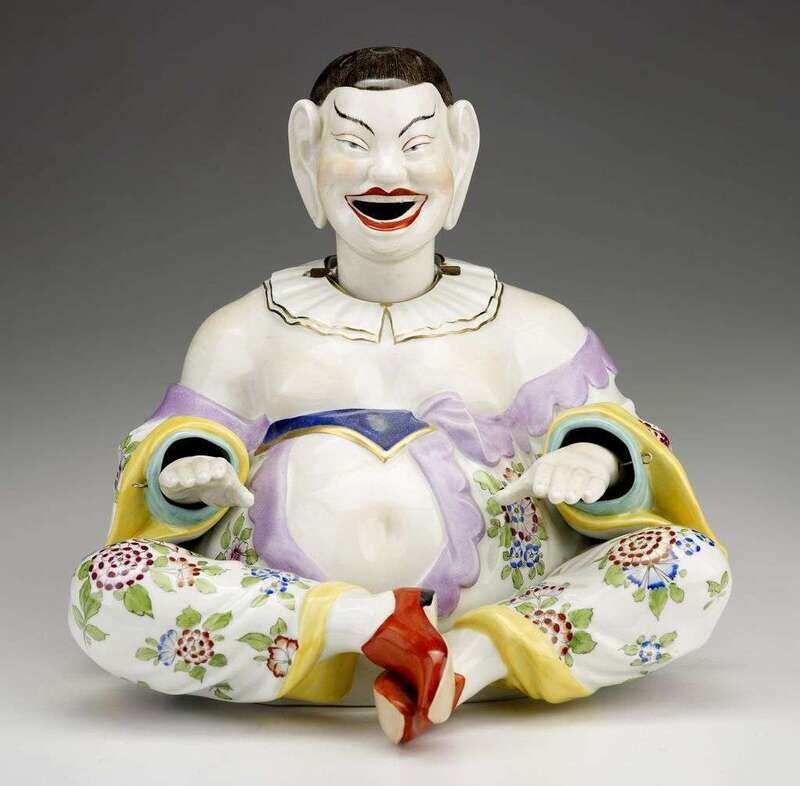 The seated figure with moving hands, head and tongue, underglaze blue mark.