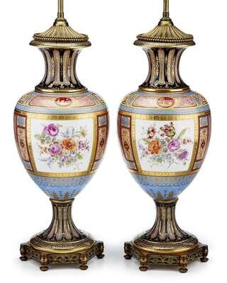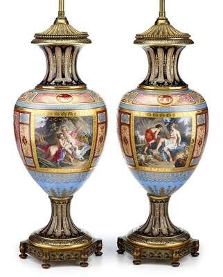 Baluster form, painted with reserves of mythological scenes, with additional panels of pink and blue, the reverse with a floral bouquet, with a cobalt and pink fluted foot and neck and allover raised gilt details and 'jewels', on a hexagonal enameled base; mounted as lamps.(2).