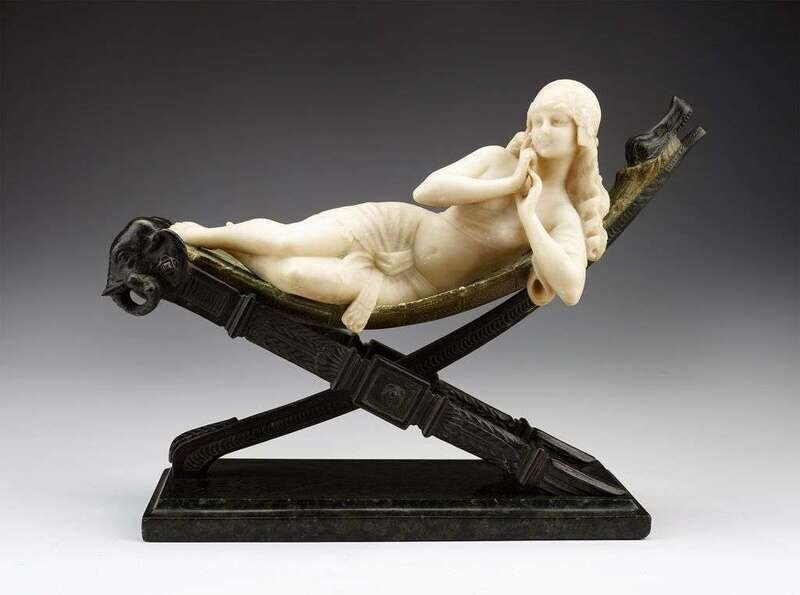The carved alabaster figure of a young Eastern woman reclining on a gilt and patinated bronze hammock, raised on a canted rectangular green marble base.