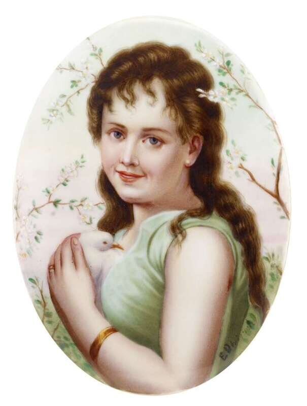 Oval, painted with a young woman holding a dove, signed indistinctly 'ED**.'.