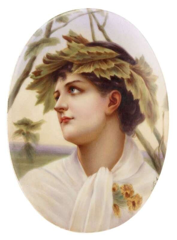 Oval, painted with a portrait of a young woman wearing a wreath of leaves, signed Lieb.