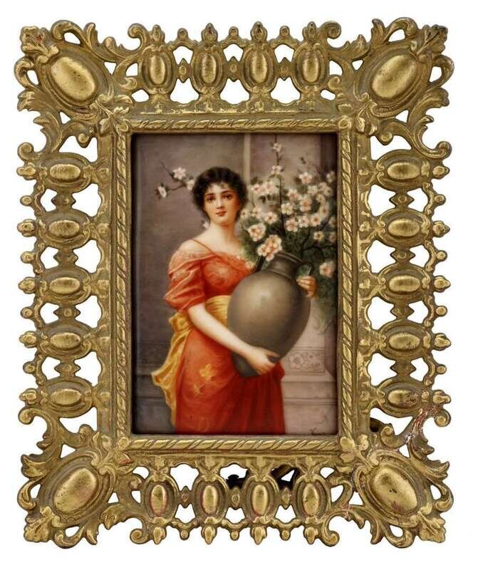 Depicting a young girl in classical dress holding an urn filled with apple blossoms, signed Wagner, impressed marks with paper label in German on reverse, in a pierced gilt metal frame.