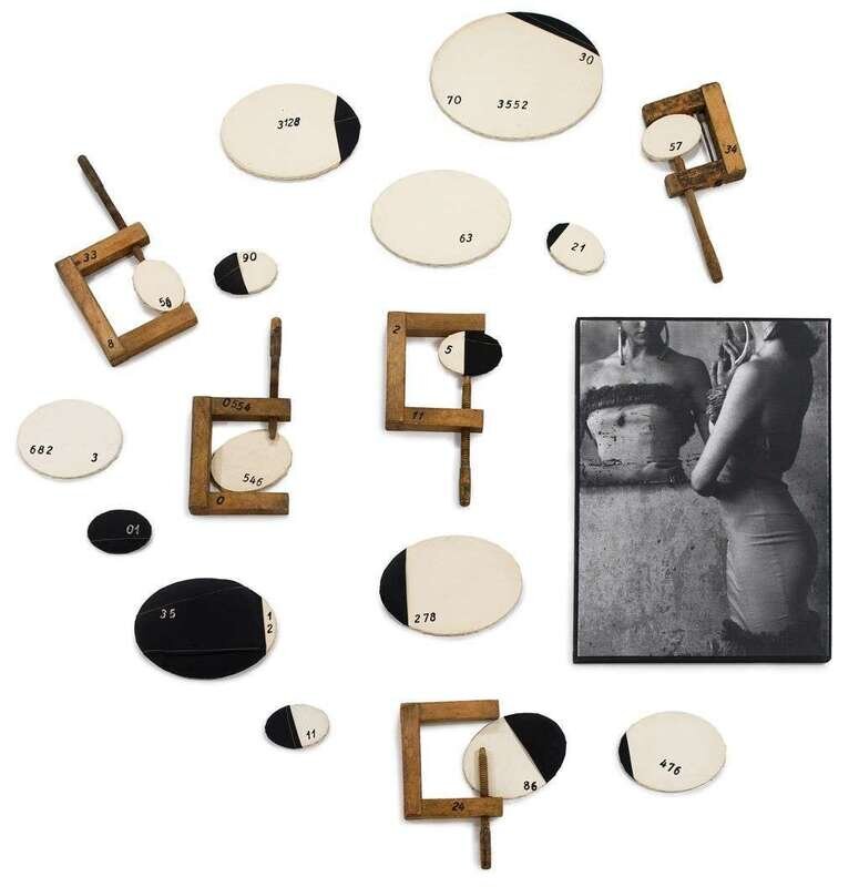 1989, acrylic on padded canvas, carpenter's vices, emulsion on canvas