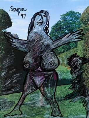 Signed and dated 'Souza / 97' upper left, inscribed with estate catalogue number ‘CR-ChmMP-97-021’ verso, chemical alteration, gouache and marker on printed magazine paper