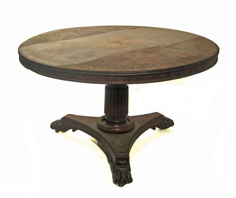 The large veneered and inlaid top with beaded edge on cylindrical, reeded support and tripartite base with lion paw feet.