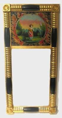 The eglomise panel depicting a young girl in a garden enclosed by a turned baluster frame.