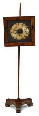 The squared frame enclosing woolworked floral wreath, on pole and three-sided platform and scrolled feet.