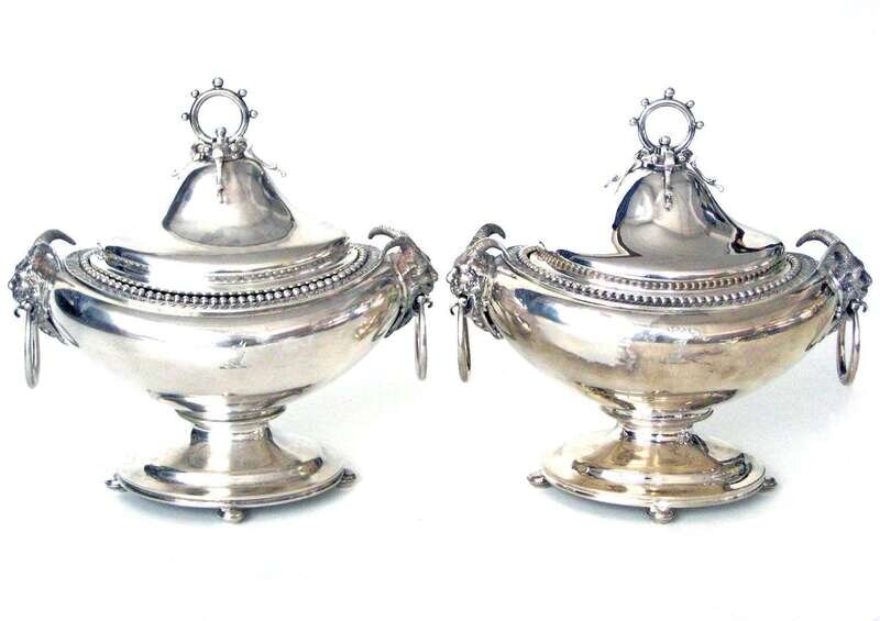 Oval boat shape with "ship's wheel" finial to lid, ram's head and oval ring handles, bead and ribbon border, oval plinth on on bun feet.